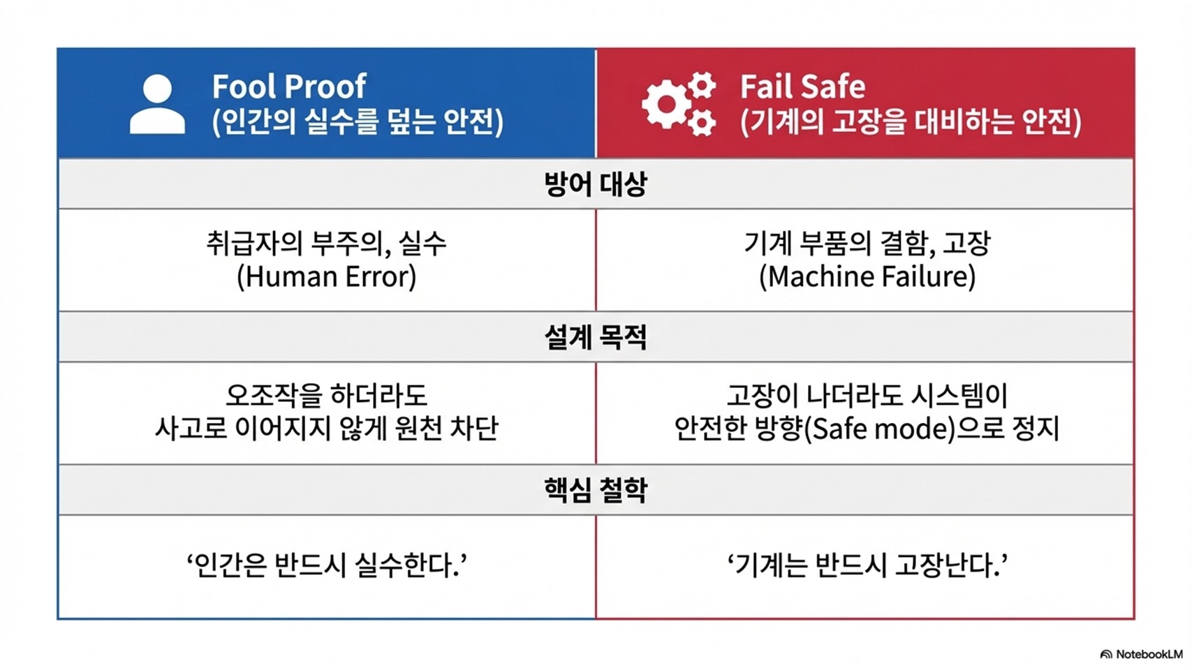 - Fail Safe: 대상은 기계(Fail) / 목표는 고장 후 안전 확보. (예: 부품 파손, 정전)