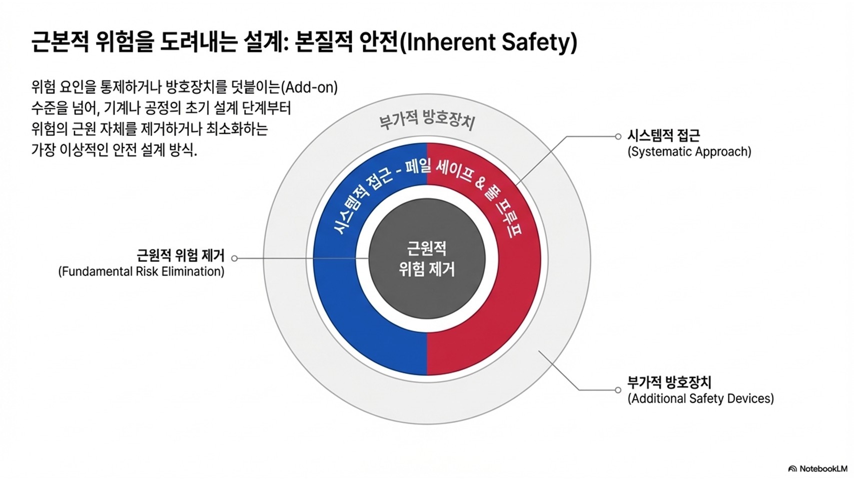 **본질적 안전(Inherent Safety)**이란 사후에 방호장치를 추가(Add-on)하는 방식이 아니라, 설계 초기 단계에서 위험의 근원 자체를 제거하거나 최소화하는 가장 이상적인 접근법입니다.