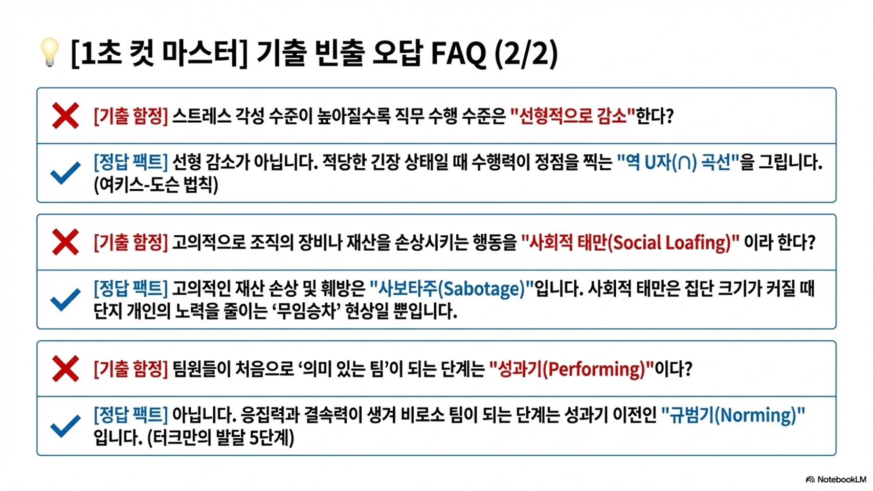 - 오답: "사회적 촉진은 모든 종류의 과업 수행 수준을 향상시킨다."