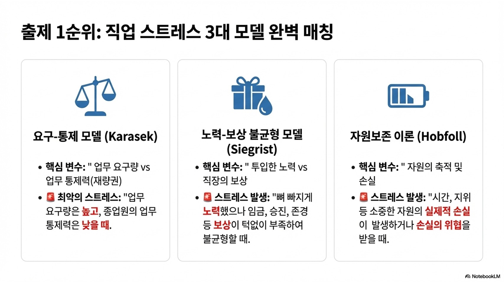 [2026년 합격 조언] 해당 파트는 매년 최소 1문제 이상 반드시 출제되며, 최근에는 역할 모호성이나 **자원보존 모델(COR)**의 세부 원리를 묻는 깊이 있는 문제가 늘고 있습니다. Karasek 모델만 보고 들어가는 우를 범하지 말고, ERI와 COR 모델의 차이점까지 정독하여 확실한 4점을 확보하시길 바랍니다.