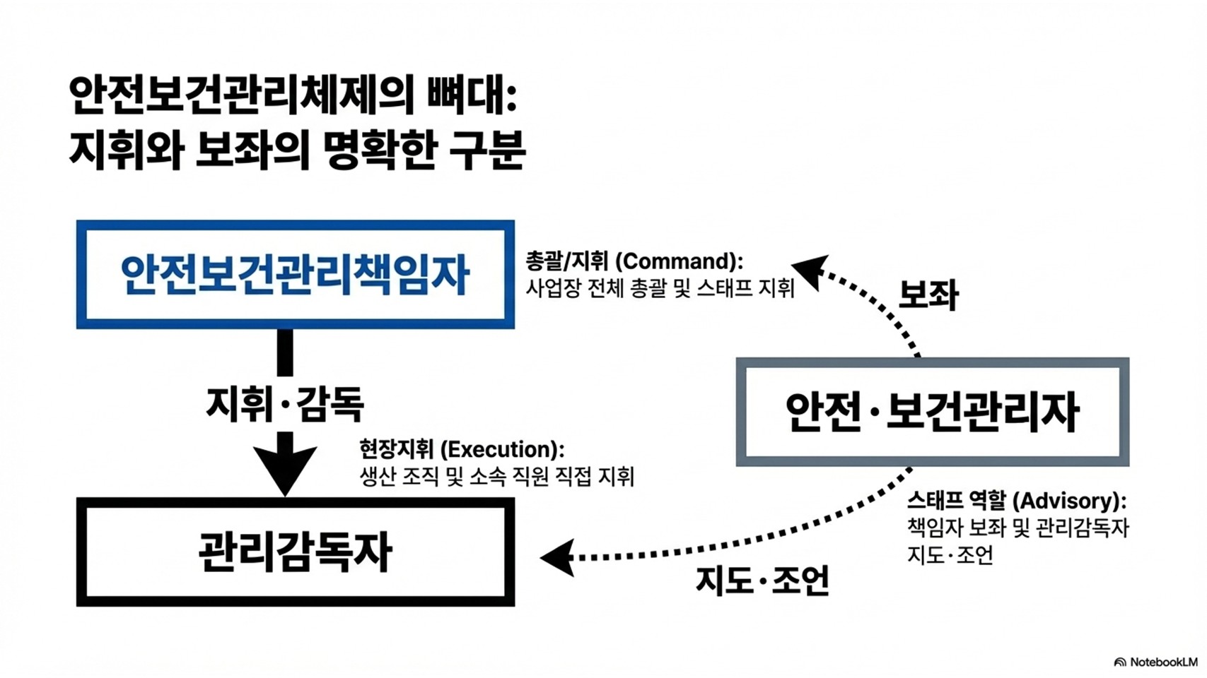 안전보건관리체제는 '누가 직접 지시하는가'와 '누가 조언하는가'를 구분하는 것에서 시작합니다.