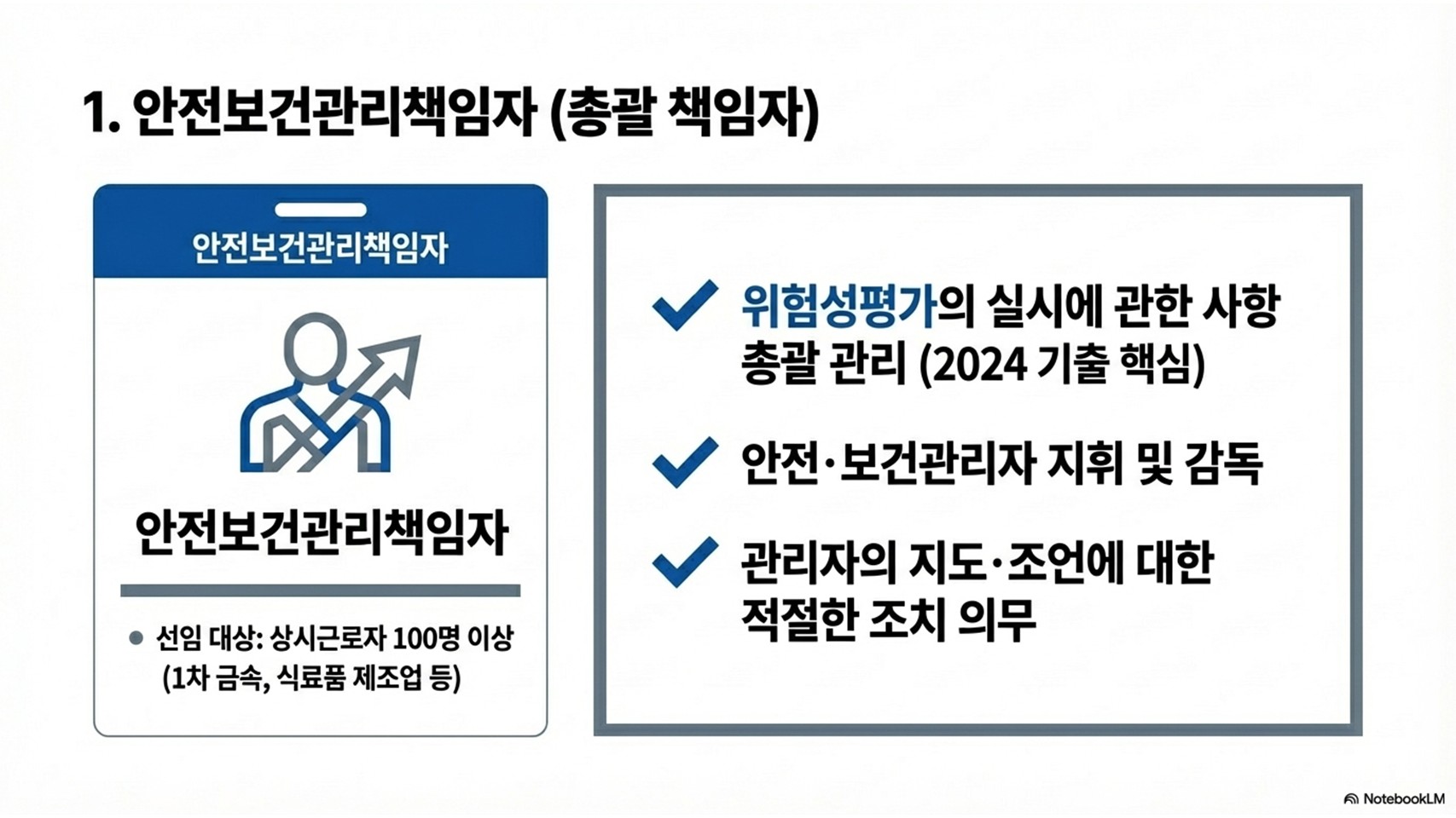 - 핵심 직무: 산업재해 예방계획 수립, 안전보건관리규정 작성, 위험성평가의 실시에 관한 사항 총괄().