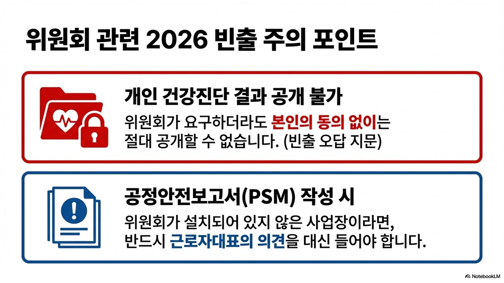 - 절대 금지: 개인의 건강진단 결과는 본인의 동의 없이 위원회에 공개할 수 없습니다(2024 오답 지문).