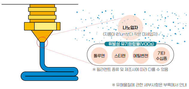 필라멘트 소재를 노즐에 넣고 가열할때 가장 많이 발생함. 즉 플라스틱을 태우면 처음에 연기가 제일 많이 발생하듯이 3D 프린터도 필라멘트를 가열해 녹이는 과정에서 유해 물질이 가장 많이 발생함.