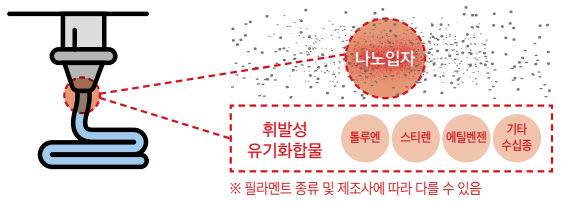 PLA,ABS등 플라스틱 필라멘트를 주로 사용하는 3D 프린터는 소재를 고열로 녹이는 과정에서 나노 입자와 휘발성 유기화합물이 발생한다고 합니다.