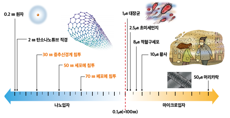 - 나노입자는 입자크기가 작아서 호흡할때 폐 깊숙한곳까지 들어가 건강에 영향을 미칠수 있다고 한다.