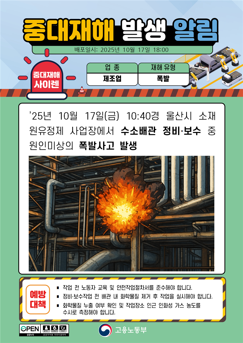 울산 원유정제 사업장 폭발사고 (중대재해) - 4M 분석 및 예방대책2025년 10월 17일, 또다시 안타까운 중대재해 소식이 전해졌습니다. 울산 소재 원유정제 사업장에서 수소배관 정비·보수 작업 중 원인 미상의 폭발 사고가 발생했습니다. 이와 같은 동종·유사 재해를 막기 위해, 해당 사고를 4M 기법을 활용하여 심층 분석하고, 산업안전보건법 및 중대재해처벌법에 기반한 실질적인 예방 대책을 수립해보고자 합니다.■ 사고 개요발생 일시: 2025년 10월 17일(금) 10:40경발생 장소: 울산광역시 소재 원유정제 사업장사고 내용: 수소(H₂)배관 정비·보수 작업 중 폭발업종 / 재해 유형: 제조업 / 폭발■ 4M 분석을 통한 사고 원인 추정제공된 자료의 '예방대책'은 사고의 원인을 역으로 추정할 수 있는..